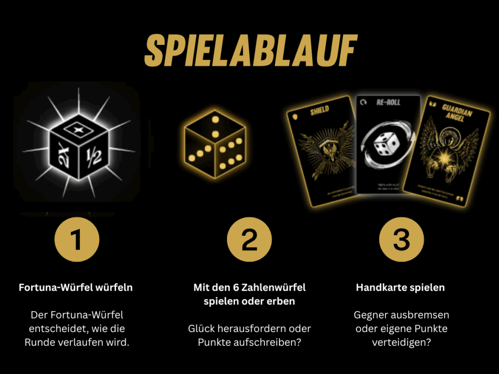 Zuerst würfelst du den FORTUNA-Würfel – der entscheidet, ob Fortuna dich anlacht oder dir gleich ein Bein stellt. Vielleicht musst du eine Karte ziehen, aussetzen, Punkte halbieren – oder mit Glück sogar verdoppeln.